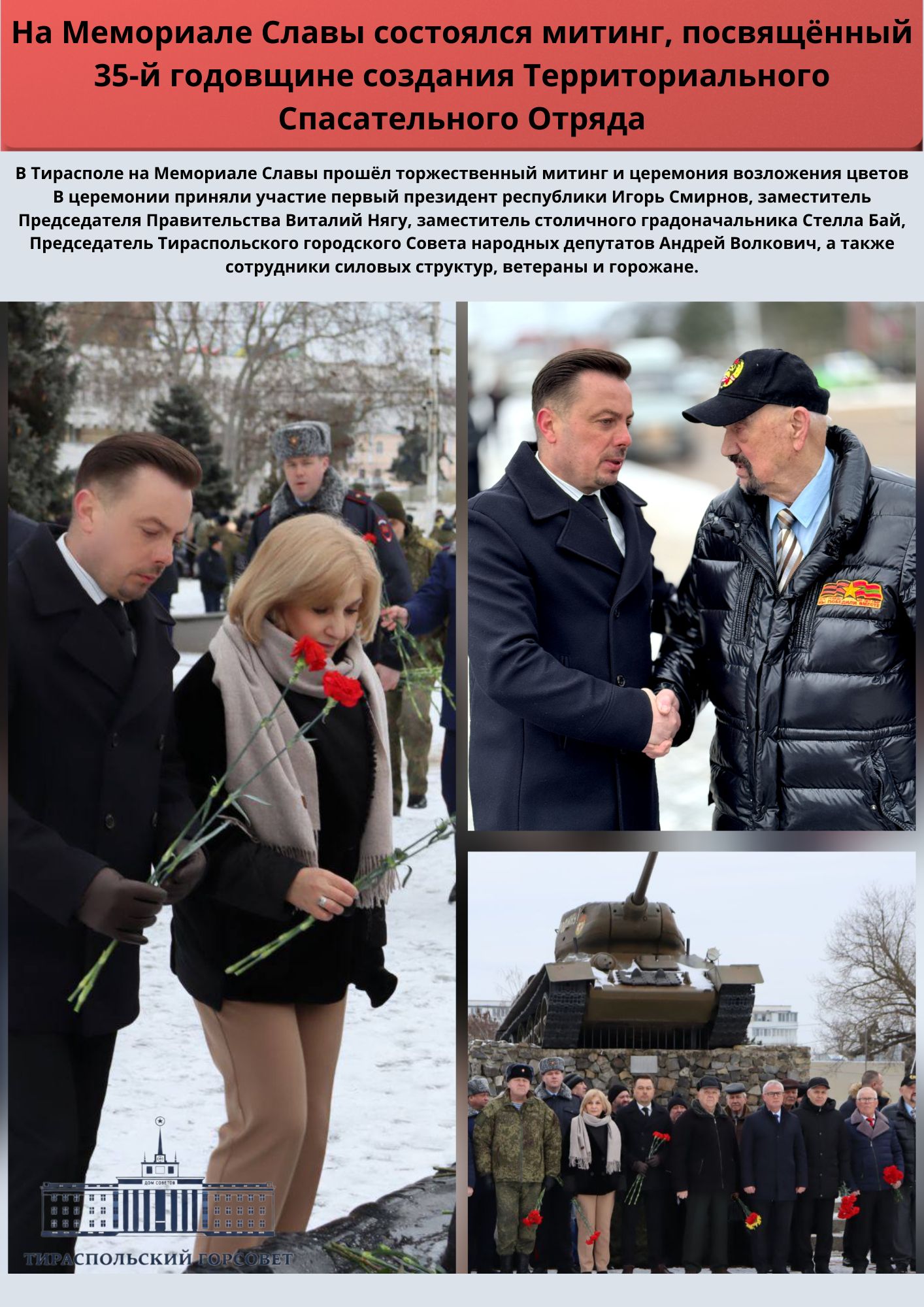 12 февраля 2026 года в актовом зале Дома Советов состоялось первое пленарное заседание 5-й сессии Тираспольского городского Совета народных депутатов 27 созыва. В работе сессии приняли участие 38 депутатов, депутаты Верховного Совета ПМР, представители государственной администрации города, прокуратуры и профильных служб. В начале заседания в торжественной обстановке депутатам Тираспольского городского Совета народных депутатов 27 созыва были вручены депутатские удостоверения. Кроме того, депутату Рите Вечтомовой была вручена государственная награда — Орден Почета.